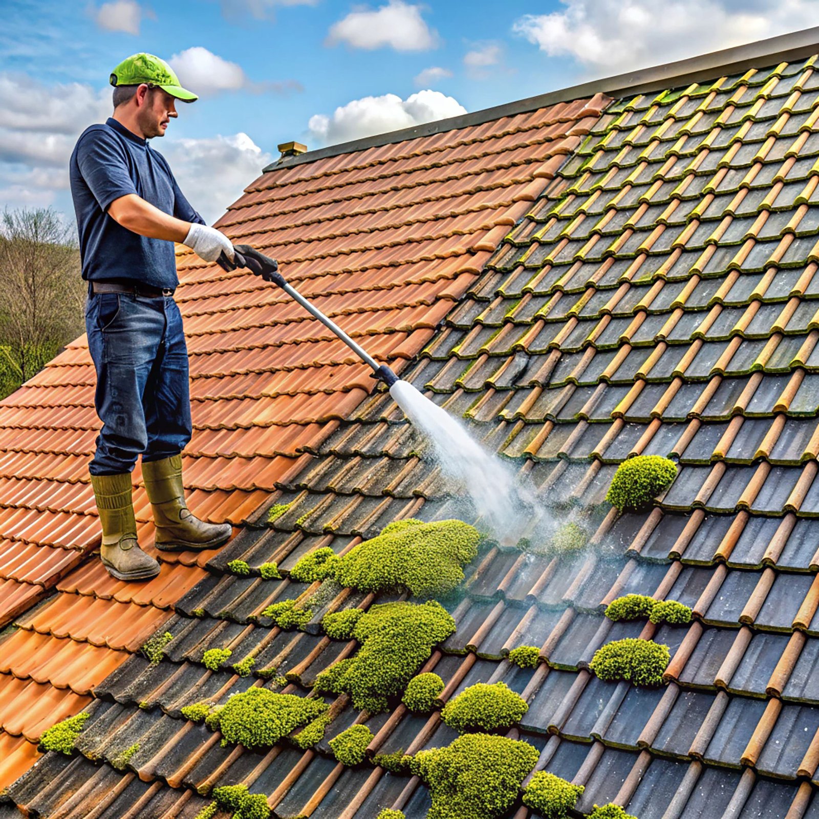 - Le démoussage, pour éliminer les mousses, lichens et algues qui fragilisent votre toiture.